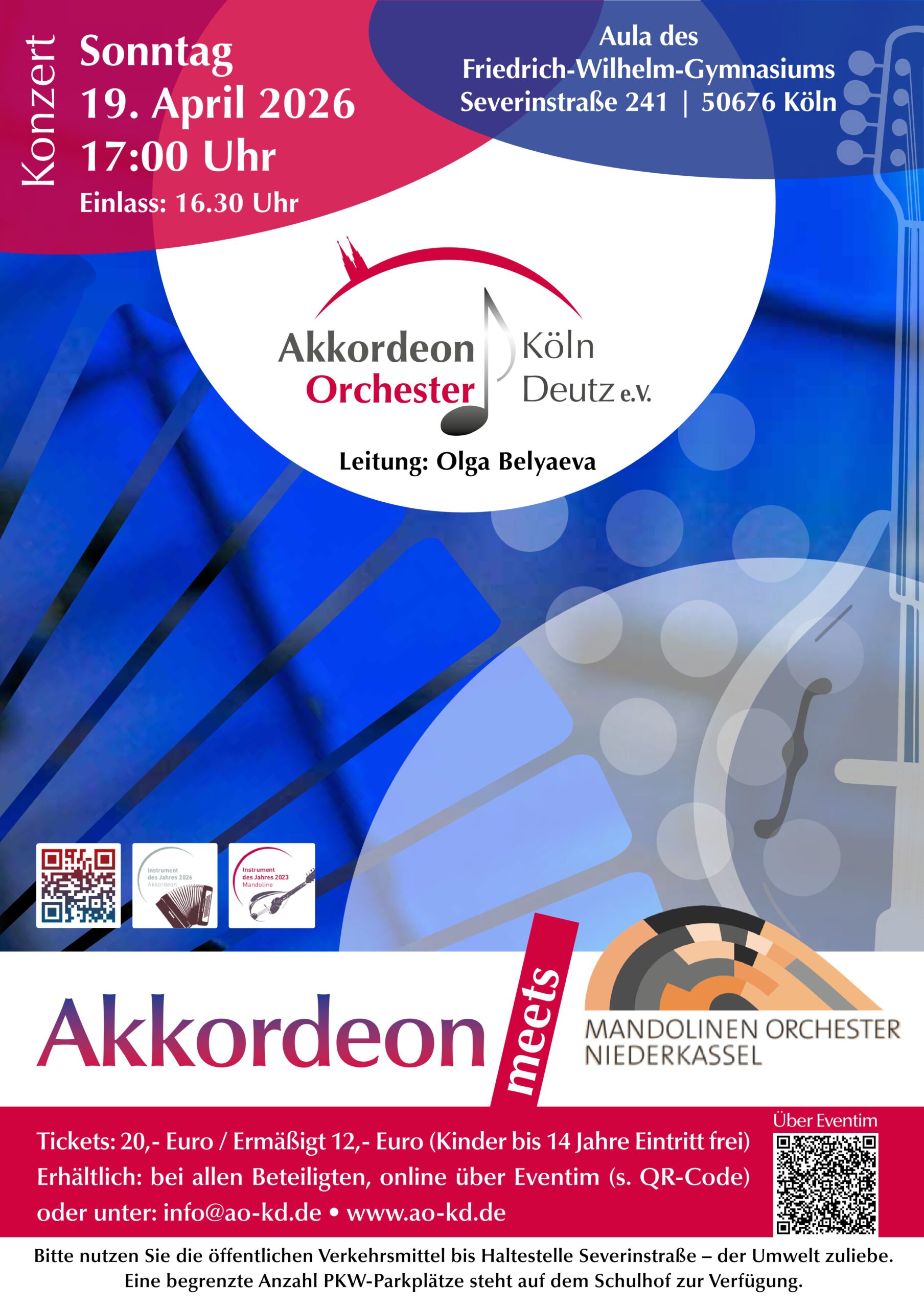 Friedrich Wilhelm Gymnasium Severinstraße 241, KölnZur Kartenbestellung Eventim Ticket-Shop Akkordeon meets Mandolinen-Orchester Niederkassel Akkordeon-Orchester Köln-Deutz Dynamisch, virtuos und mit viel Liebe zur Musik begeistert das Akkordeon-Orchester Köln-Deutz e.V. immer wieder das Publikum.Querbeet spielen […]